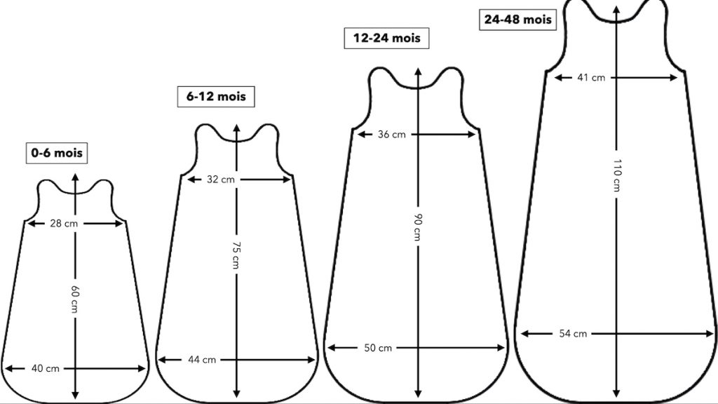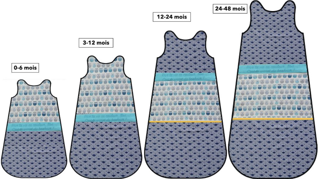 Les gigoteuses bébé sont plus ajustées au niveau du buste pour mieux contenir l’enfant. Les kits de couture sont livrées avec des boutons pressions supplémentaires pour permettre de bien s’adapter à la taille de bébé. En effet, il est possible de régler 3 paramètres :