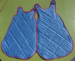 Pour renforcer la gigoteuse, j’ai opté pour un tissu plus épais pour le fond de la gigoteuse. Vous aurez donc dans vos kits soit des coupons en velours côtelés, soit en jeans ou en coton épais (= cretonne) qui seront plus résistants à l’usure et donc plus adaptés aux escapades de nos aventuriers en herbe.