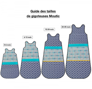 Les gigoteuses doivent aussi contenir bébé et est être ajustées à la taille de bébé. Il faut être vigilant à ce que la gigoteuse ne soit pas trop grandes pour éviter tout risque d’étouffement. En effet, l’enfant peut glisser au fond de la gigoteuse si elle n’est pas assez ajustée. Il faut prendre une gigoteuse adaptée au gabarit de votre enfant, notamment au niveau de l’encolure et des emmanchures. Avec vos kits Moutic, vous aurez plusieurs lots de boutons pression KAM pour réaliser une gigoteuse réglable. Vous pourrez régler votre gigoteuse au niveau des bretelles, de la large du buste et de la profondeur du sac de la gigoteuse. Voici le lien pour connaître les différentes tailles des gigoteuses Moutic