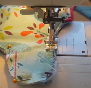 6 – Placer le bord de sabot extérieur le long des bords du tissu. Normalement la pliure du biais doit se trouver au ras de l’ouverture pour l’aiguille du sabot. Décaler votre aiguille en latérale pour qu’elle arrive à 1 mm de la pliure. Couture au point droit (longueur 3 largeur 0). Commencez par 3 points d’arrêt. Enlever les épingles au fur et à mesure. Finissez par 3 points d’arrêt.